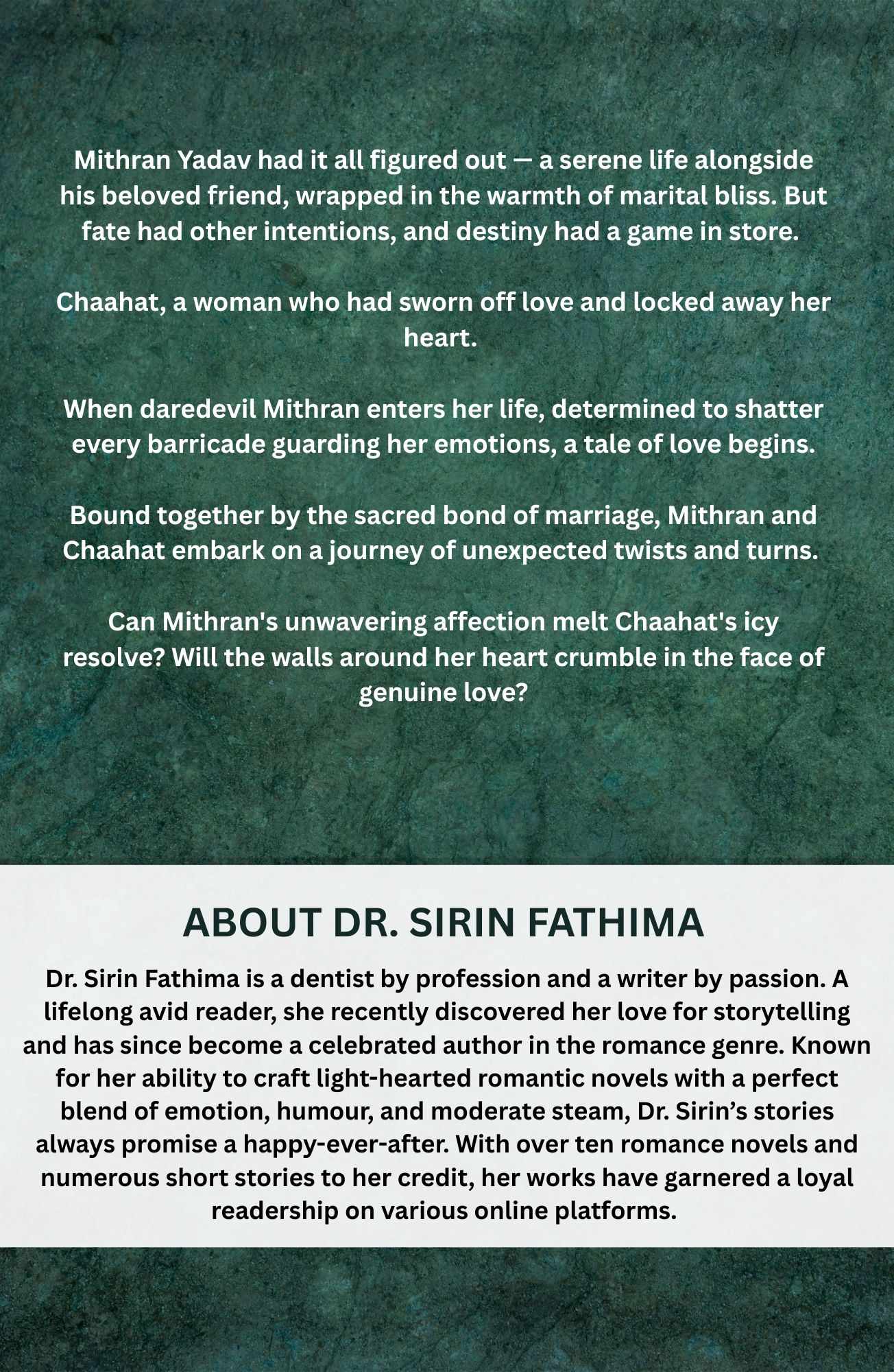 Mithran Yadav had it all figured out — a serene life alongside his beloved friend, wrapped in the warmth of marital bliss. But fate had other intentions, and destiny had a game in store. Meet Chaahat, a woman who had sworn off love and locked away her heart. When daredevil Mithran enters her life, determined to shatter every barricade guarding her emotions, a tale of love begins. Bound together by the sacred bond of marriage, Mithran and Chaahat embark on a journey of unexpected twists and turns. Can Mithran's unwavering affection melt Chaahat's icy resolve? Will the walls around her heart crumble in the face of genuine love? Only time will tell how their love story unfolds.
